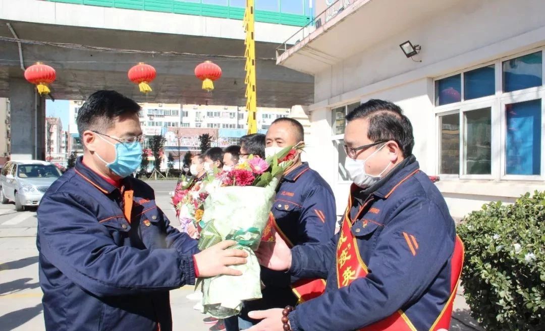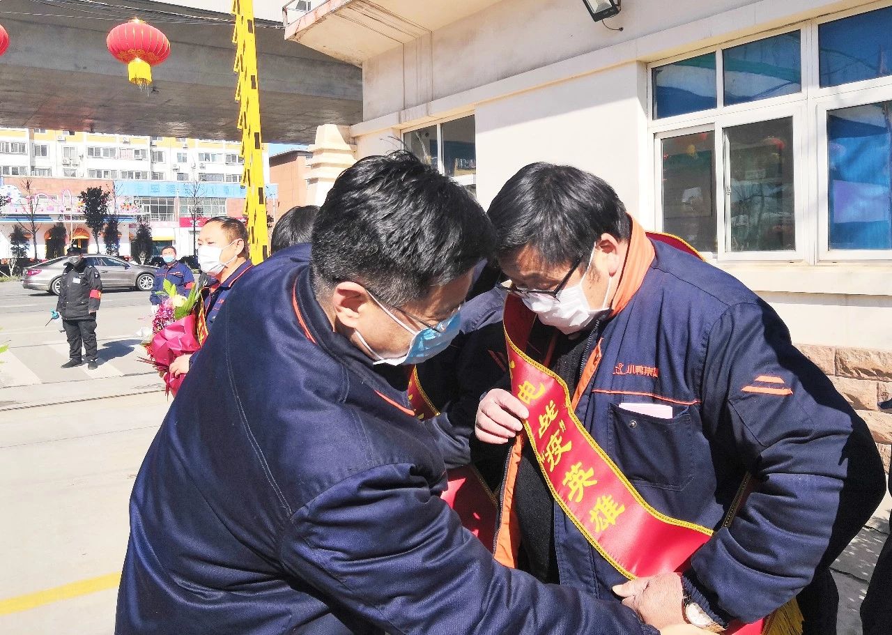(集團(tuán)黨委委員、家電公司總經(jīng)理邢照斌為“六勇士”佩戴綬帶、獻(xiàn)花)