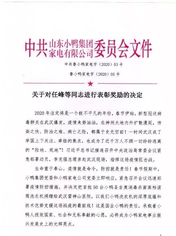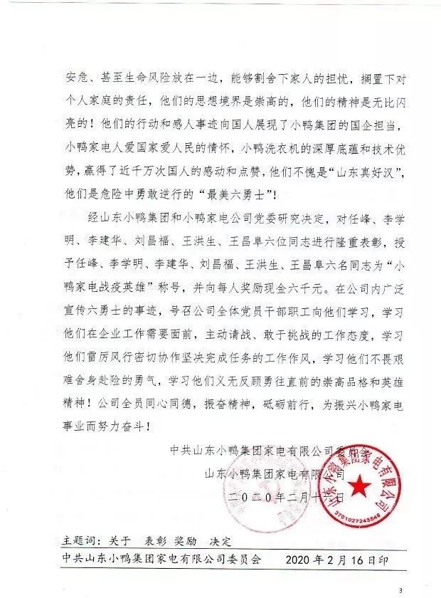 小鴨家電公司黨委副書記、工會主席劉吉榮主持會議,宣讀《關(guān)于對任峰等同志進(jìn)行表彰獎勵的決定》。經(jīng)集團(tuán)和家電黨委研究決定,授予任峰、李學(xué)明、李建華、劉昌福、王洪生、王昌阜六名同志為“小鴨家電戰(zhàn)'疫'英雄”稱號,給予獎勵。