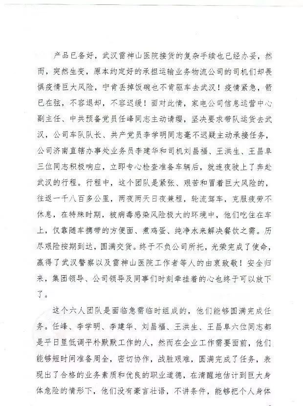 集團(tuán)黨委委員、家電公司總經(jīng)理邢照斌表示,在企業(yè)最需要的時候,小鴨家電“六勇士”不顧個人安危、挺身而出、主動請纓并出色完成任務(wù),第一時間將洗衣機(jī)交付到一線。他們的精神深深的感動著小鴨所有員工,塑造了小鴨良好的企業(yè)形象,他們是小鴨集團(tuán)、小鴨家電當(dāng)之無愧的戰(zhàn)“疫”英雄。